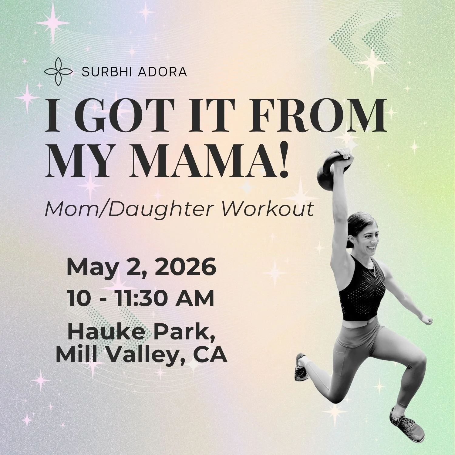 I Got It From My Mama is a 90-minute outdoor strength session + celebration for moms and daughters to train together. Led by Surbhi Adora, this intimate community event will blend guided movement, functional strength training, and the kind of mother/daughter fun that sticks with you. Because the most powerful thing you can model for your daughter is showing up.